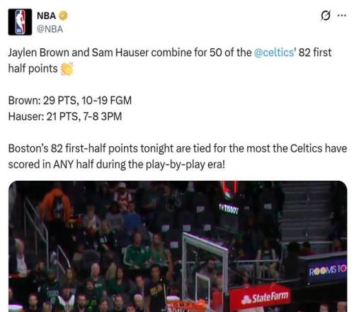 第二节拿下52分让凯尔特人半场轰下82分,不仅创造本赛季球队上半场得分纪录,也是引进实时解说以来凯尔特人队史半场最高得分纪录。